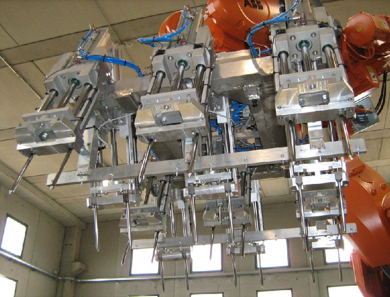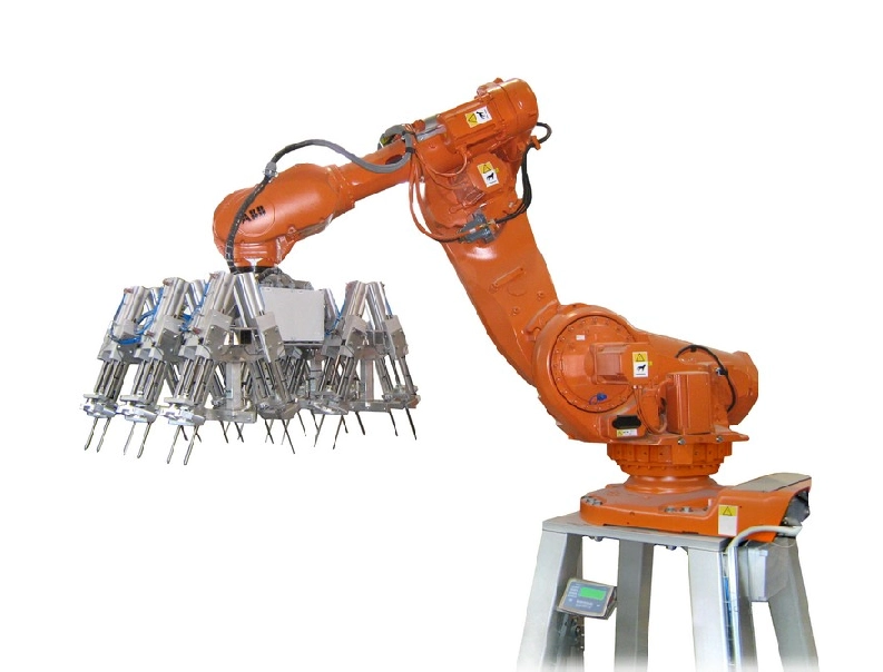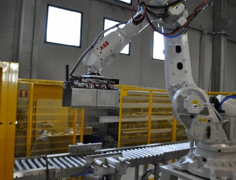 We have developed two different palletizing technologies. The first one moves the entire layer after having pressed it on a special forming table. The gripping head picks up six bales at the same time through a system of pneumatically operated pins.