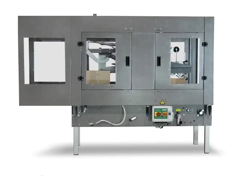 Carton closer machine by tape; up to 1200 boxes/hour. The case taping machine closes the upper and the lower side of american cardboard boxes.