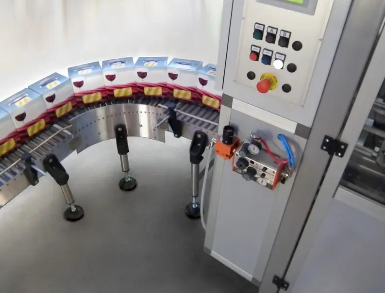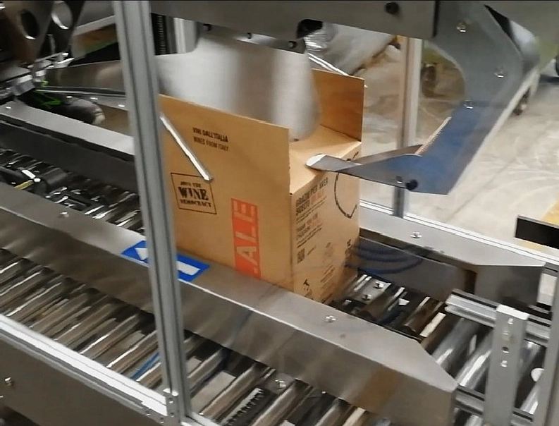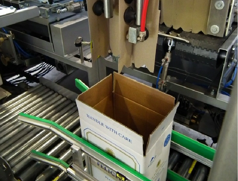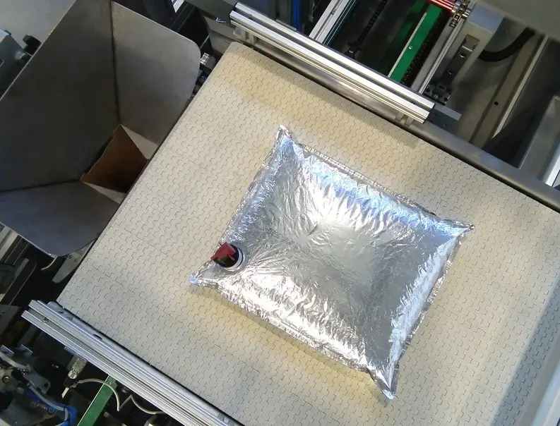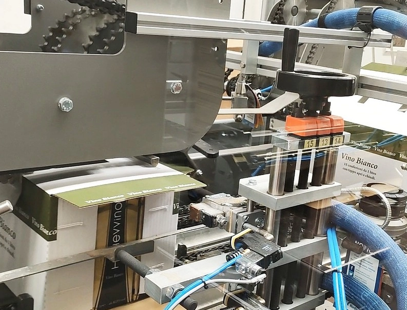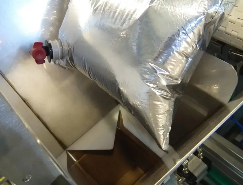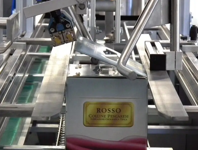 The bag in box case packers are able to form the cardboard by taking it from the magazine, insert the bag inside it and close the upper flaps with glue. They are therefore single block machines that are inserted downstream of the aseptic bagging machine