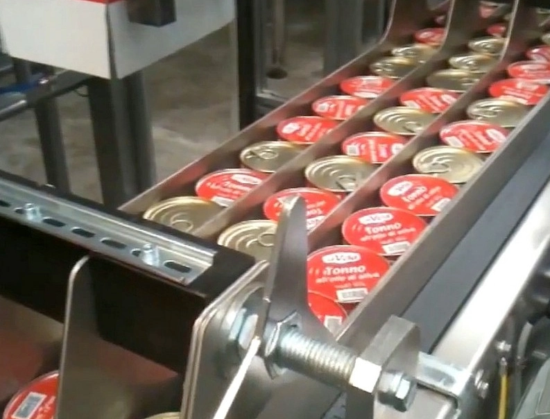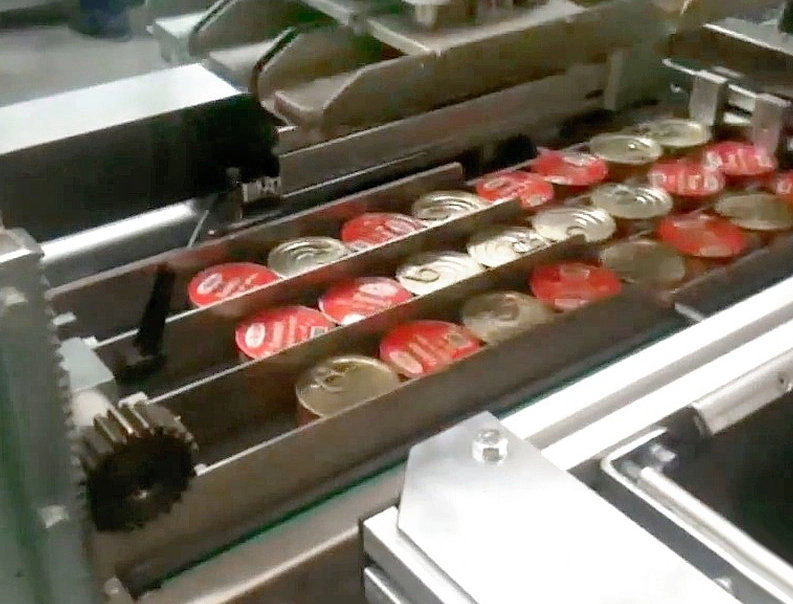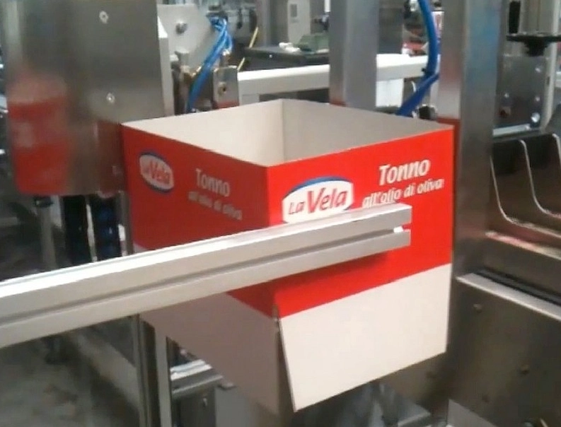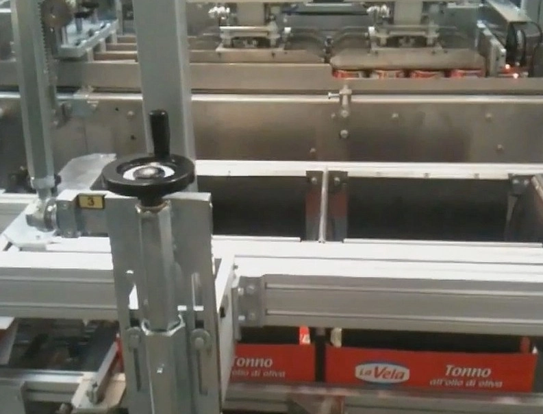 Monoblock case packer with two heads for cans of tuna fish – magnetic head – integrated case erector