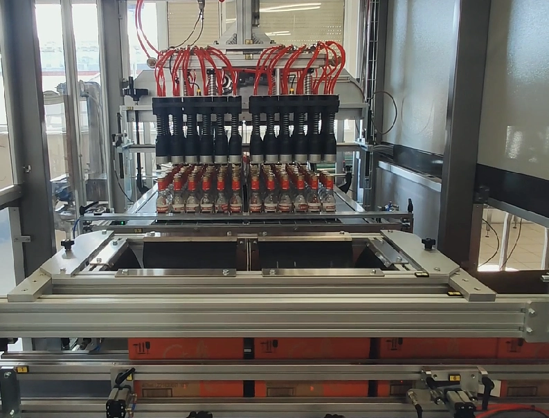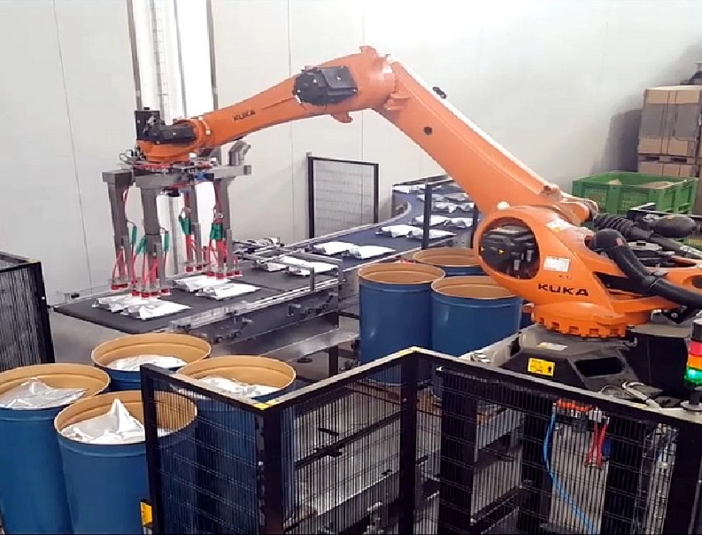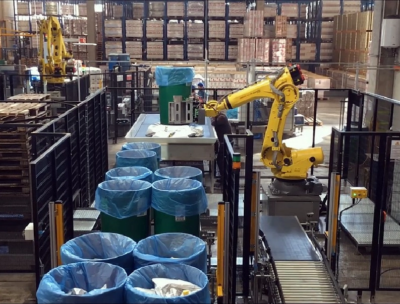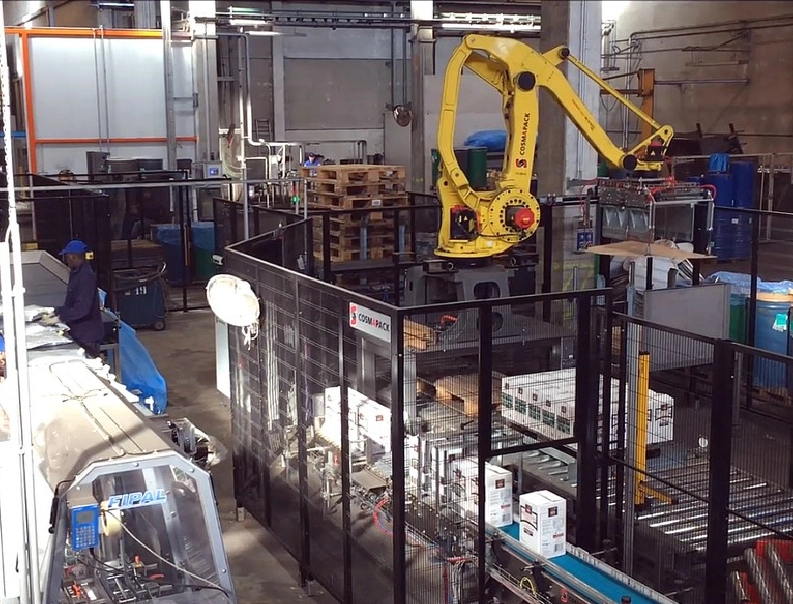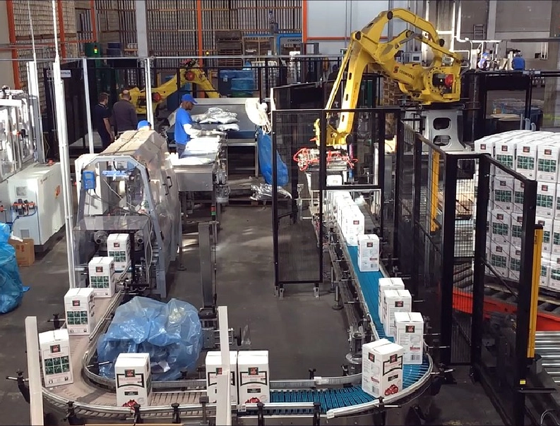 Robotic line for processing tomato sauce in bags – Robot for containers filling – robot for containers empying – case packer – robot palletizer