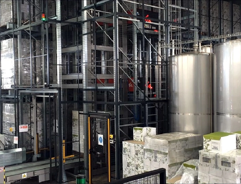 Complete line for handling edible oil in PET bottles. Depalletisation, devider before the cartoning machin, palletizer, stretchwrapper and warehouse loading with elevator