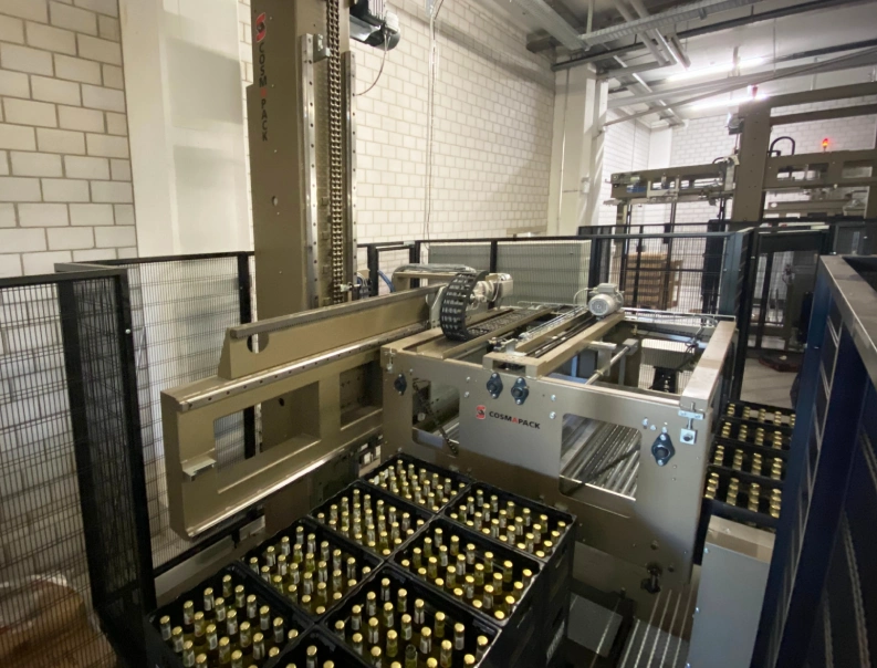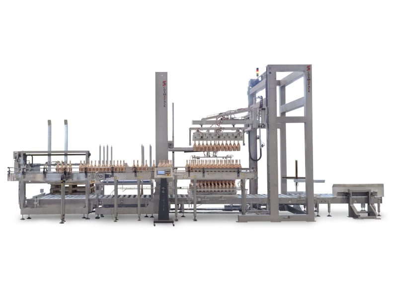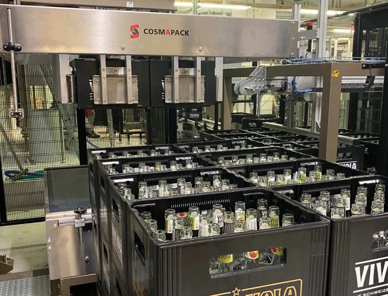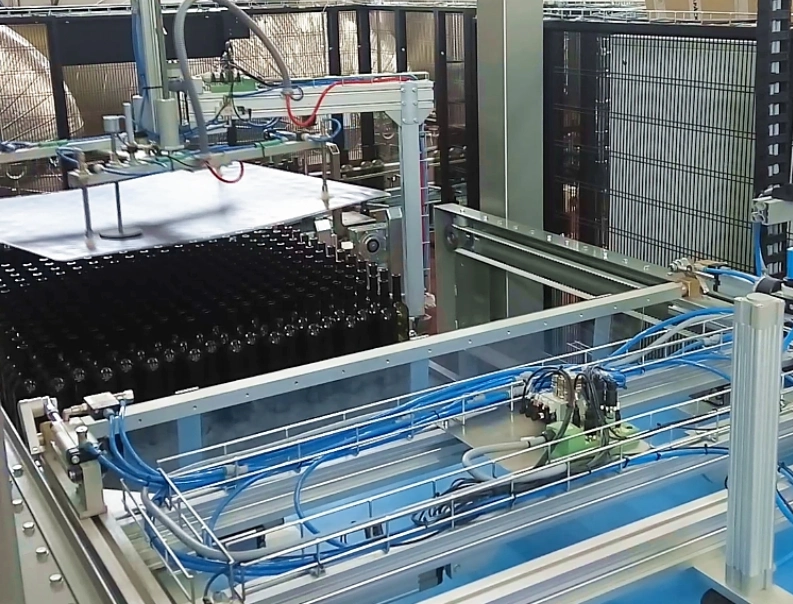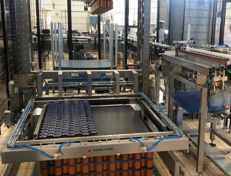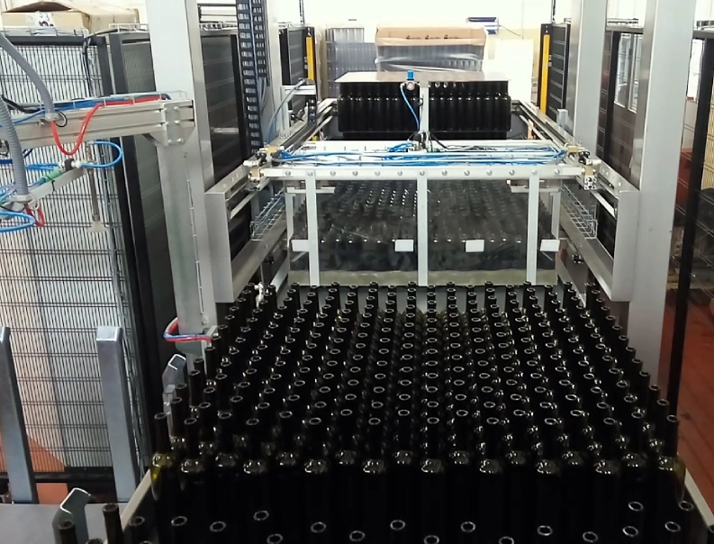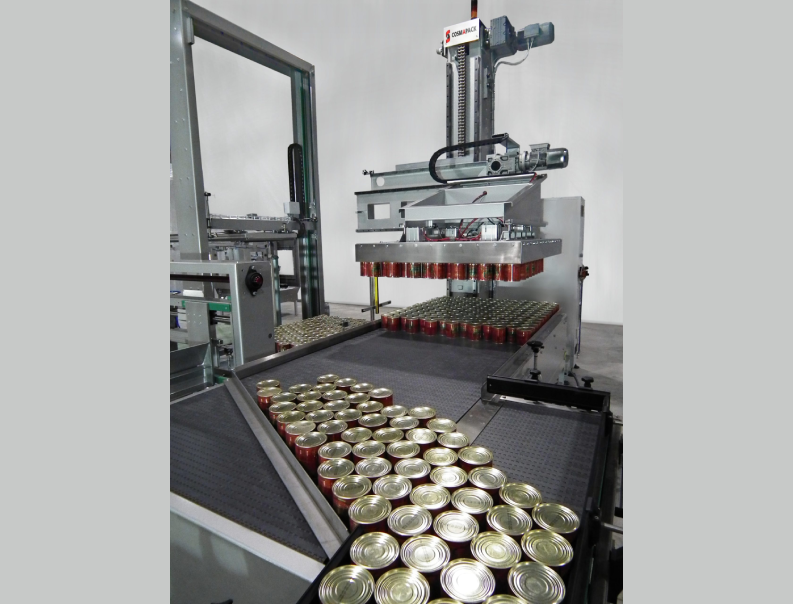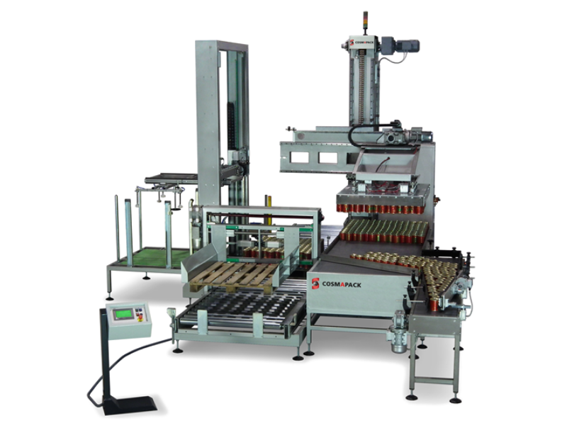 Cartesian depalletizers are not very common, given the difficulty of determining the position of the goods to be transferred from the pallets. Cosmapack has been the first producer of cartesian bottle depalletizer due to a smart yet simple product searching algorithm that allows its machine to find the correct picking position of the product. The speed of this this type of machines is generally compatible with small production lines and have the benefit of occupying a very small area when compared to traditional palletizers. On the contrary the lack of accumulation table leads also to a line with reduced buffer and therefore this type of machine can not be used for medium or high production speeds. Cartesian depalletizers can be equipped with automatic interlayer placement device and also with full pallet transfer automation, including the pallet magazine where the depalletized pallets are stacked.