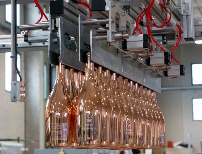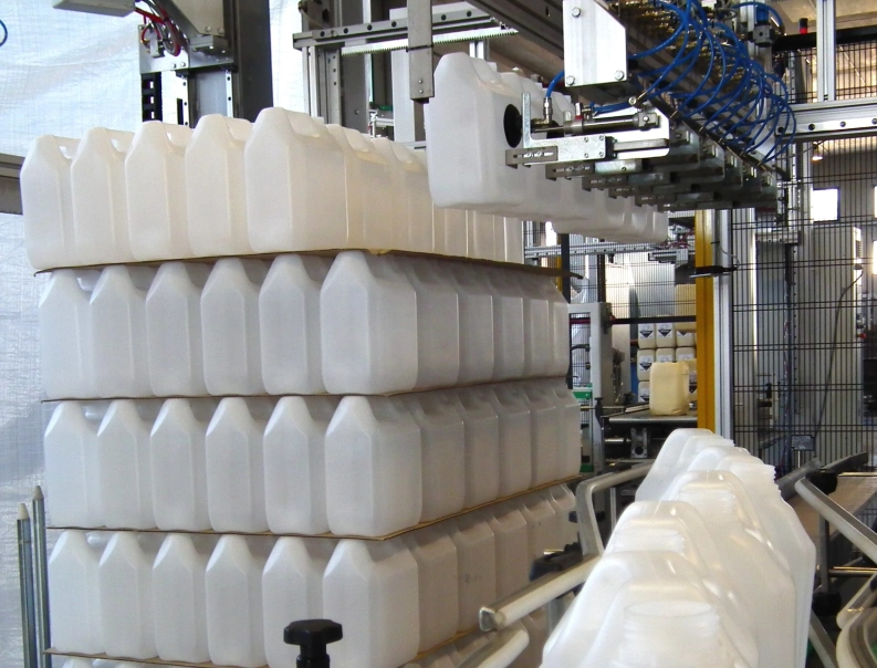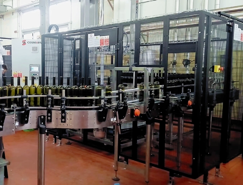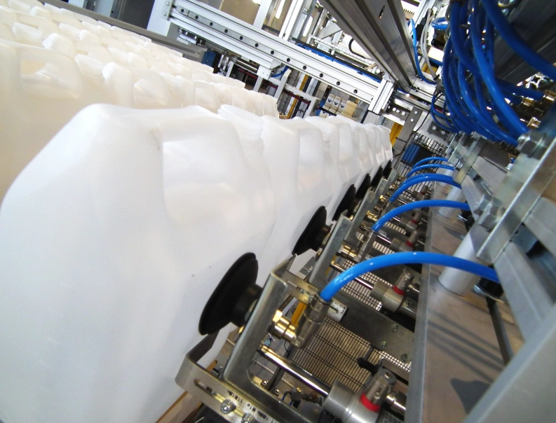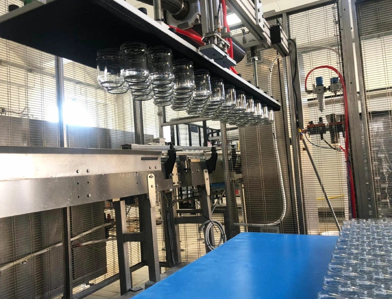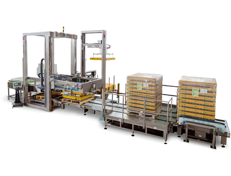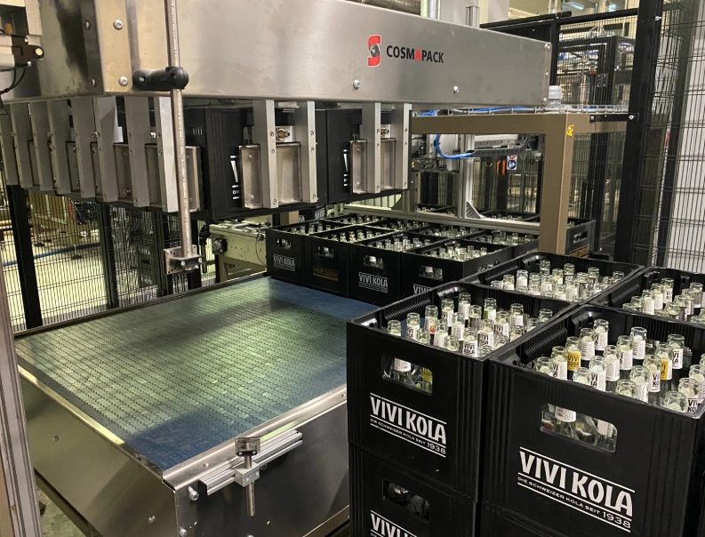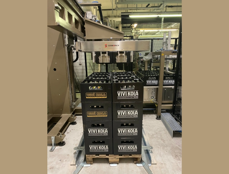 Cartesian depalletizers are not very common, given the difficulty of determining the position of the goods to be transferred from the pallets. Cosmapack has been the first producer of cartesian bottle depalletizer due to a smart yet simple product searching algorithm that allows its machine to find the correct picking position of the product. The speed of this this type of machines is generally compatible with small production lines and have the benefit of occupying a very small area when compared to traditional palletizers. On the contrary the lack of accumulation table leads also to a line with reduced buffer and therefore this type of machine can not be used for medium or high production speeds. Cartesian depalletizers can be equipped with automatic interlayer placement device and also with full pallet transfer automation, including the pallet magazine where the depalletized pallets are stacked.