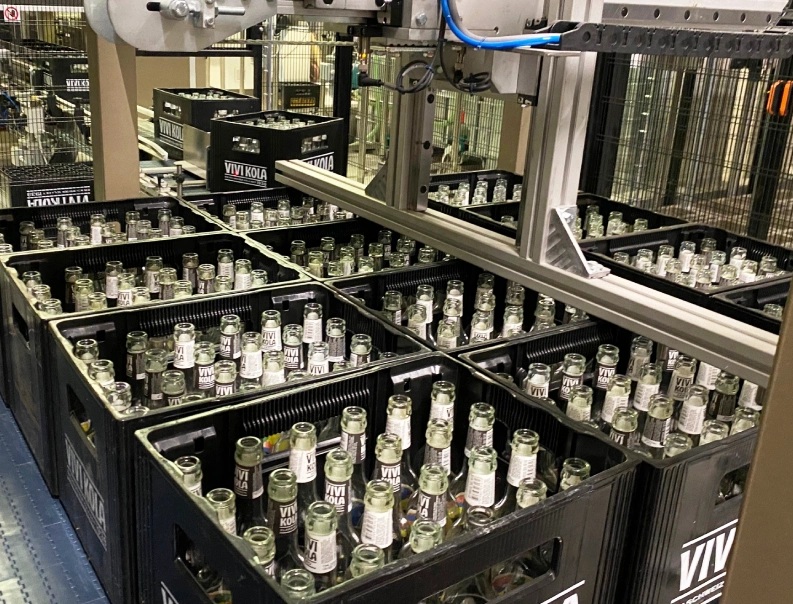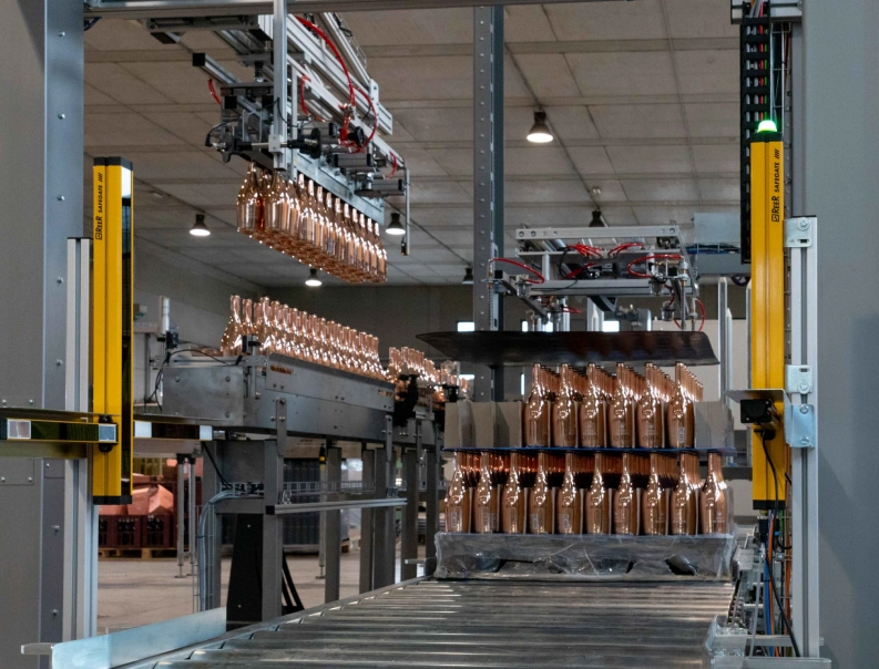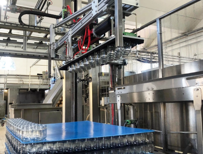 Palletiser / depalletiser robot for full/empty bottles of mineral water in racks
