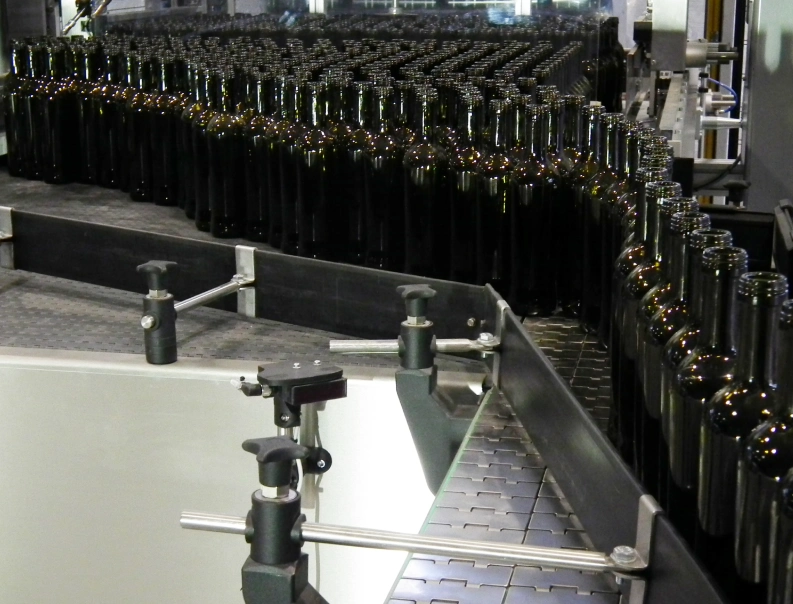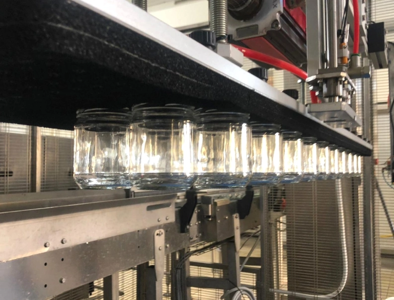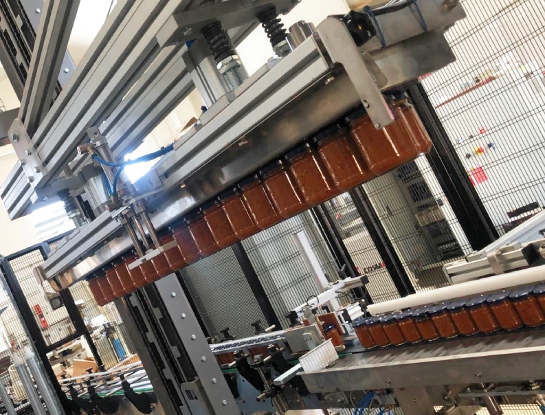 Sweep off depalletizer for tomato sauce filled bottles, transferring the full layer
