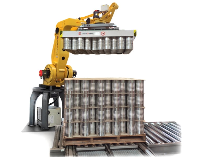 The magnetic head robot depalletizers allow the depalletization of bulk product. The magnetic head allows you to pick up all ferrous-based containers or with iron-based twist off cap. The product is then released on the accumulation plane where it is subsequently aligned on a single lane.