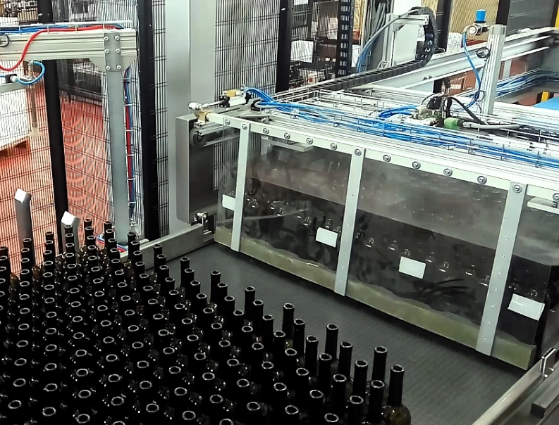 DS11A is an automatic depalettizer for glass bottles, jars or cans, separated through plastic or carton cardboard. It can work with any kind of product with medium-high production speeds.