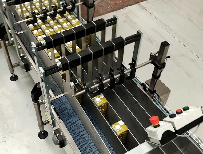 The continuous diverters allow the product to be diverted without stopping the flow. Their main feature is the presence of a telescopic arm which, during the transversal translation, comes off accompanying the product and following it at the same speed of advancement of the belt.