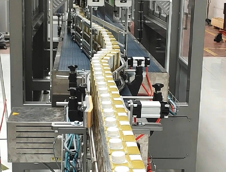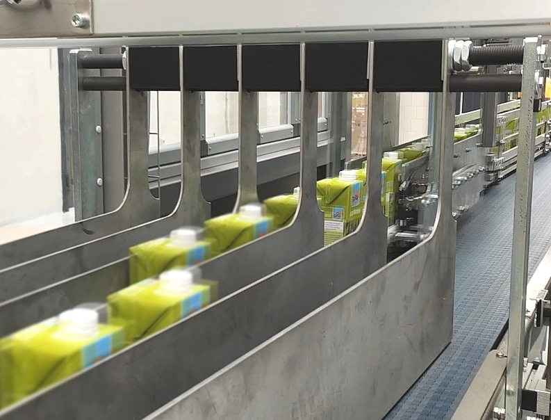 When the bottles are not round, the preparation of the layer to be transferred needs a dedicated machine that divides the flow of the product in multiple channels. We build dividers that allow continuos flow for fast production lines, or also intermittent flow for slower paces.