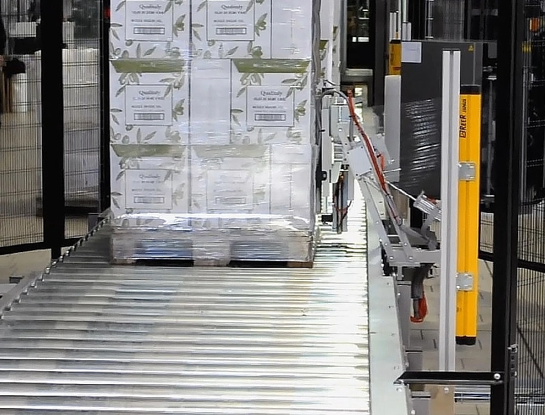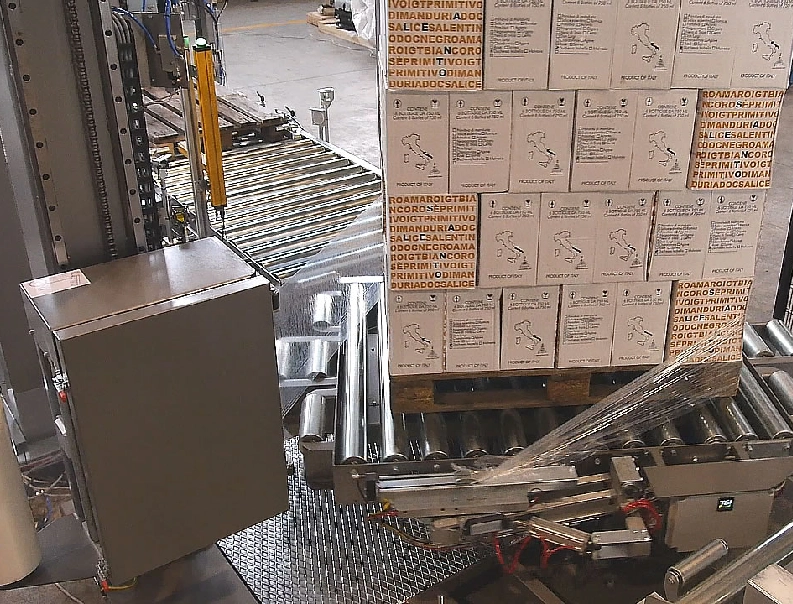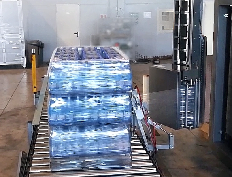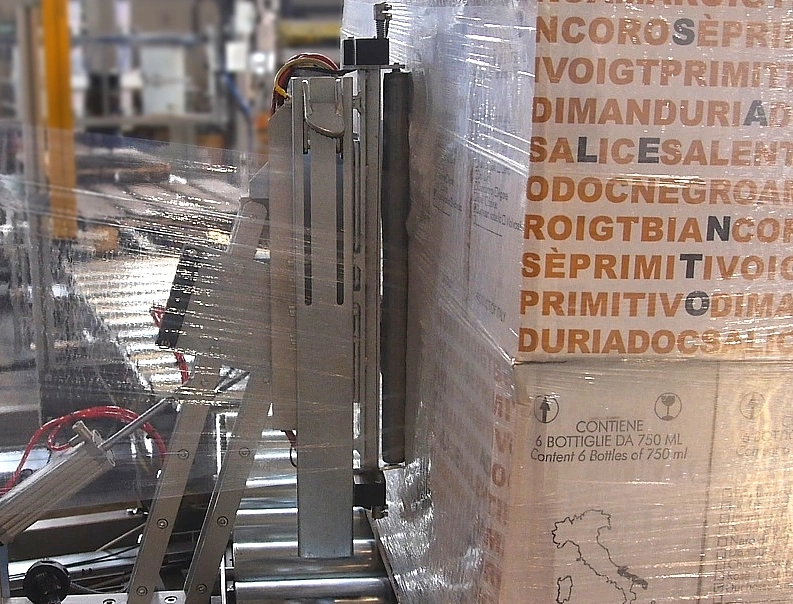 The rotating platform stretchwrappers are simple and reliable machines in which the film reel moves only vertically while the rotation is performed by the rotary movement of the roller conveyor. The stability of the pallet is guaranteed by a pneumatic pusher which acts from top to bottom.