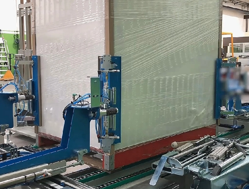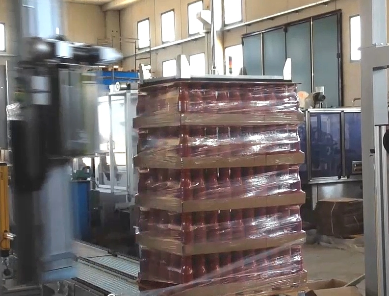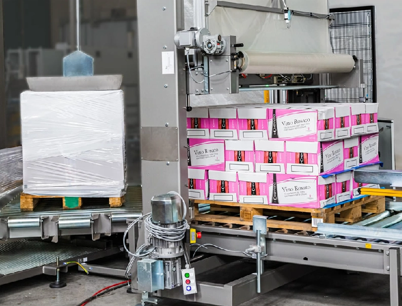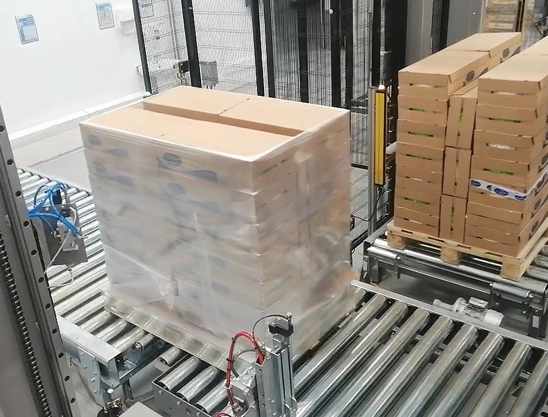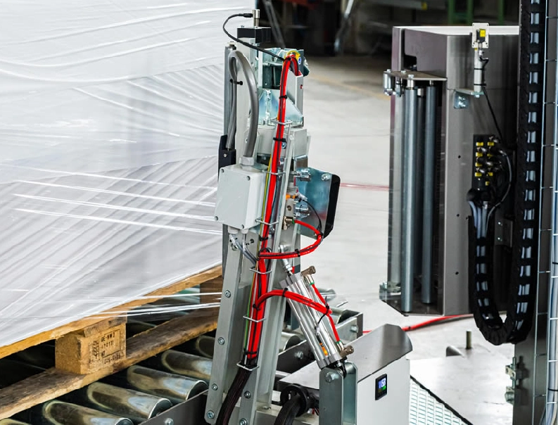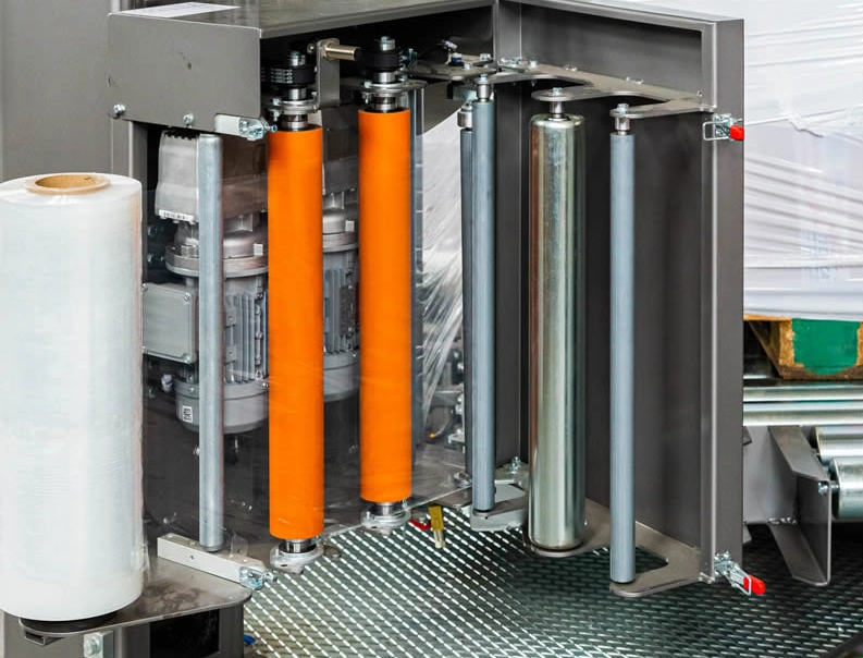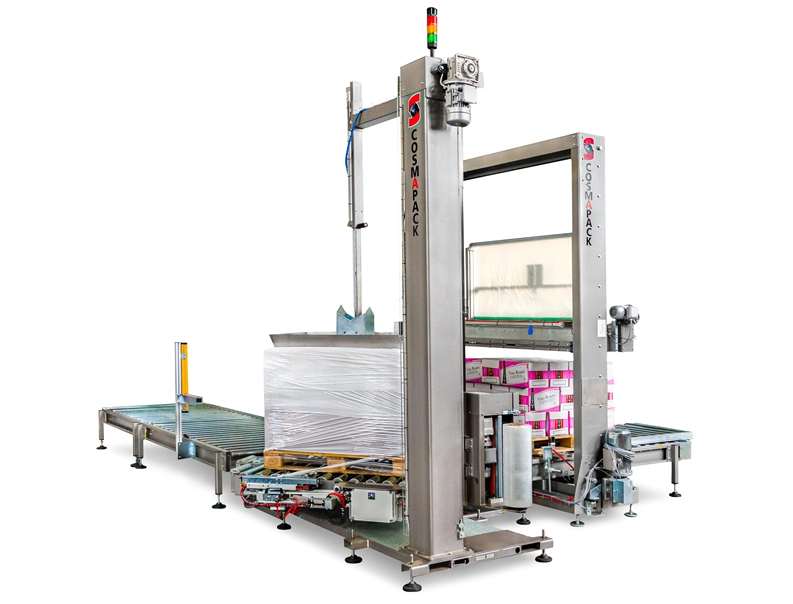 We build stretchwrappers of two different kinds: The rotating arm stretchwrappers and the rotating platform stretchwrapers. The first technology allows faster rotation speed because the product is not subject to centrifugal force, while the latter is used for smaller speeds. All our machines can be equipped with top cover sheet applicator, top pneumatic pusher and also film edge welder. The pre-stretch percentage can be changed electronically and a control of the film tension continuously corrects the unwinding speed in order to guarantee a homogeneous film tension during winding.